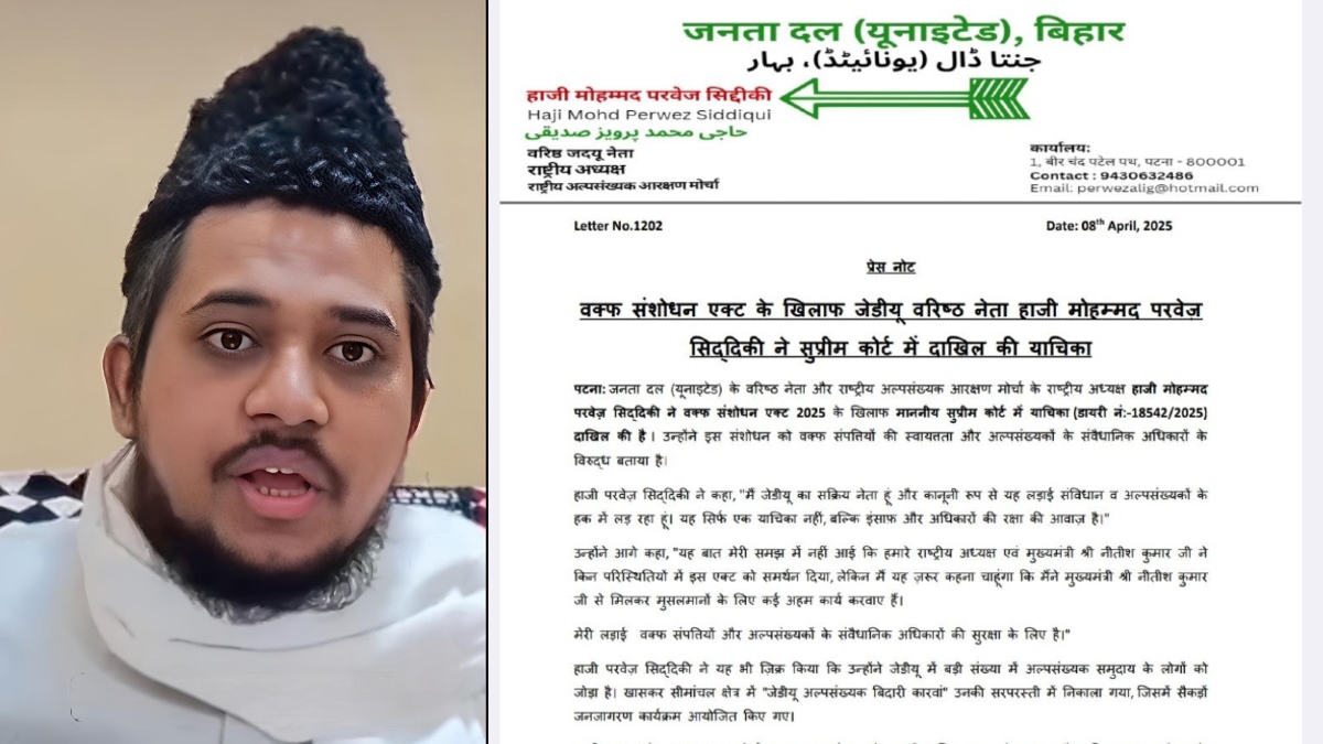 Haji Mohammad Parwez Siddiqui Challenge Waqf Bill In Supreme Court: वक्फ संशोधन अधिनियम पर देश भर में सियासी संग्राम मचा हुआ है। पक्ष विपक्ष के बीच आरोप प्रत्यारोप का दौर भी जारी है। वहीं जदयू के नेताओं में भी नाराज़गी देखने को मिल रही है। इसी क्रम में जदयू के दिग्गज नेता और अल्प संख्यक आरक्षण मोर्चा के राष्ट्रीय अध्यक्ष, हाजी मोहम्म परवेज़ सिद्दीकी ने पार्टी में रहते हुए संशोधन बिल को सुप्रीम कोर्ट में चुनौती दी है।