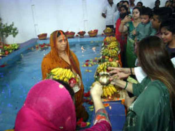 अस्ताचलगामी सूर्य को अर्घ्य देने के लिए राबड़ी देवी करीब 4:40 बजे अपने आवास में बनाए गए कुंड में पहुंची। कुंड में उतरने के बाद राबड़ी ने पूजा में इस्तेमाल होने वाले सारे सामान को सिंदूर लगाया।