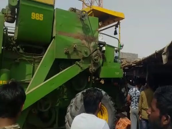 फसल कटाई की मशीन बेकाबू होकर सब्जी की दुकान में घुसी, लोगों में मची अफरा-तफरी