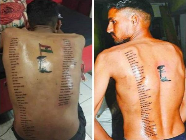 14 फरवरी को सीआरपीएफ के काफिले पर हुए आतंकी हमले में 40 जवान शहीद हो गए थे। इसके अलावा 18 फरवरी की तड़के आतंकवादियों के खिलाफ एनकाउंटर किया गया, जिसमें मेजर वीएस ढौंढ़ियाल समेत तीन जवान शहीद हो गए थे। बीकानेर के गोपाल सारण ने पुलवामा के सभी शहीद जवानों समेत 71 शहीदों के नाम के टैटू बनवाए है। साथ उही पीठ पर तिरंगा भी गुदवाया है। गोपाल की मानें तो बीकानेर संभाग मुख्यालय होने के बावजूद शहीद स्मारक नहीं होने उसने अपनी पीठ पर शहीदों के नाम लिखवाए हैं।