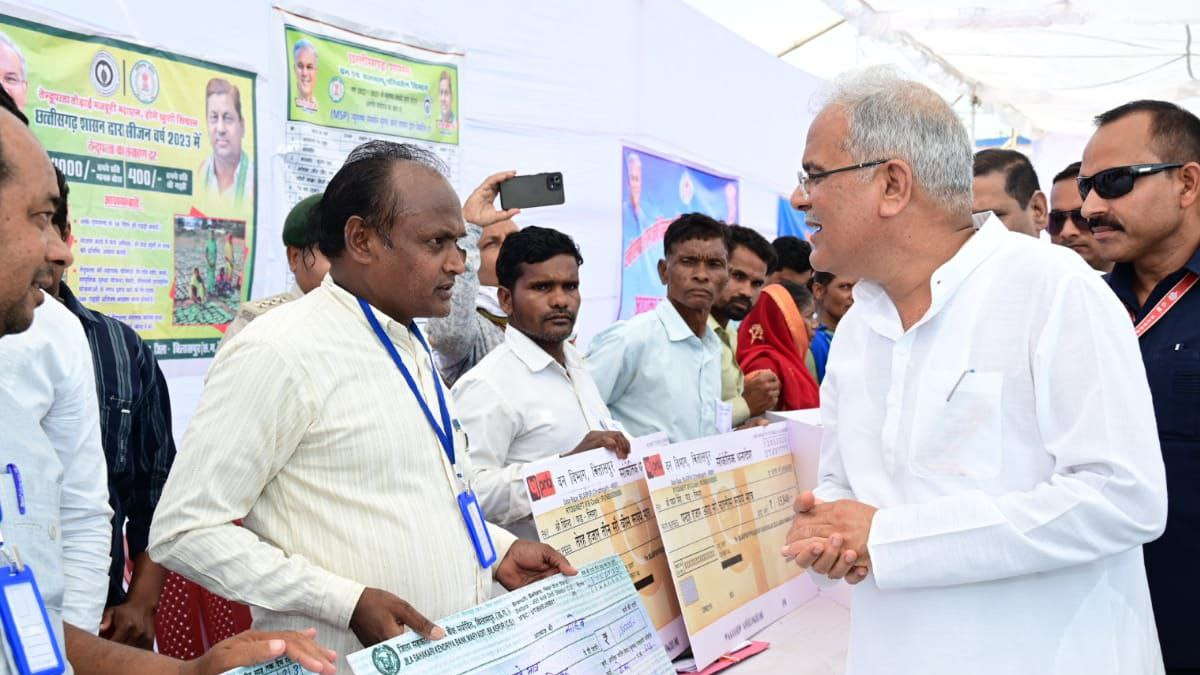 Bhent Mulakat Bilaspur: मुख्यमंत्री भूपेश बघेल ने बिलासपुर जिले के बेलतरा विधानसभा क्षेत्र में आयोजित भेंट-मुलाकात के दौरान राज्य सरकार की विभिन्न योजनाओं एवं कार्यक्रमों के तहत हितग्राहियों को समाग्री वितरण किया। उन्होंने 5 हितग्राहियों को नेपसेक स्पेयर, 5 हितग्राहियों को कृषि यांत्रिकीकरण मशीन राशि 59 हजार, 5 हितग्राहियों को फुटकर मत्सय विक्रय एवं नाव जाल, 2 हितग्राहियों को नोनी सशक्तिकरण सहायता योजना के तहत 40 हजार रूपए, 1 हितग्राही को मुख्यमंत्री निर्माण, श्रमिक मृत्यु एवं दिव्यांग सहायता योजना के तहत 1 लाख रूपए, महेन्द्र कर्मा तेंदूपत्ता सामाजित सुरक्षा योजना के तहत 2 लाख रूपए और तेंदूपत्ता संग्रहण वर्ष 2022 का पारिश्रमिक भुगतान 52 हजार 880 रूपए का चेक वितरण किया।
