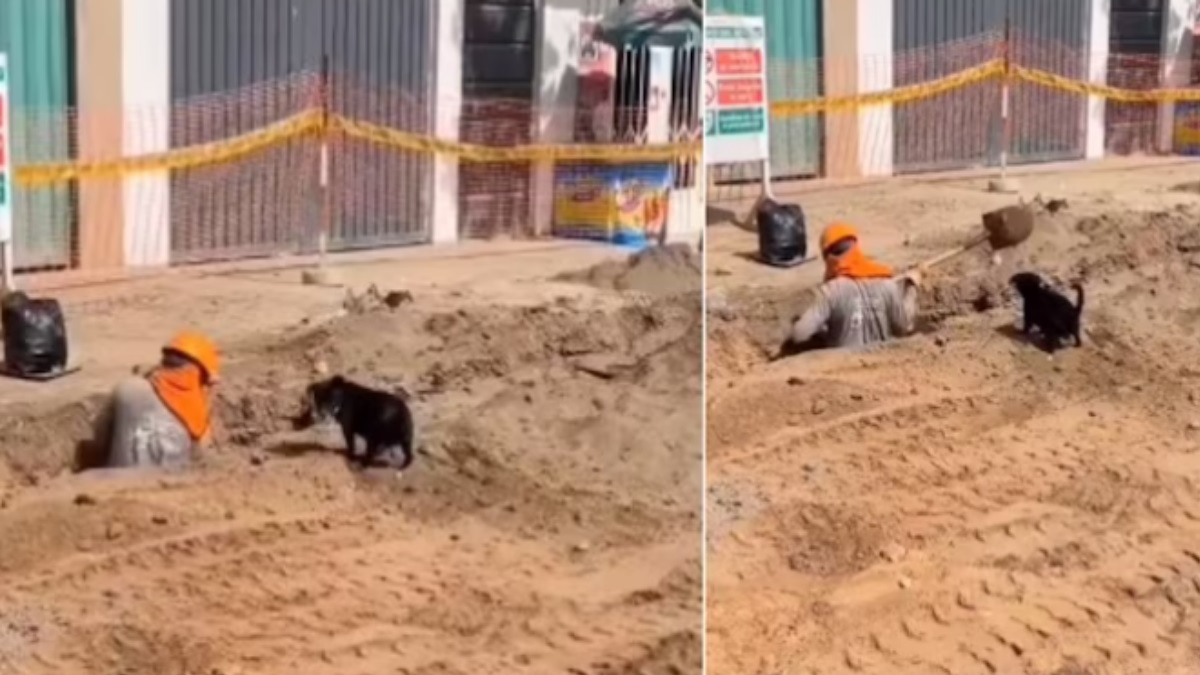 वीडियो में दिख रहा है कि एक श्रमिक गड्ढे से मिट्टी निकाल रहा है और सामने एक छोटा सा पपी खड़ा है। जैसे ही श्रमिक मिट्टी बाहर फेंकता है तो पपी उस मिट्टी को फैला रहा है। वीडियो बेहद ही प्यारा है।