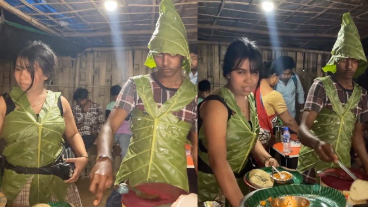 वीडियो में साफ देखा जा सकता है कि एक लड़का और लड़की ठेले पर छोले कुलचे बेच रहे हैं। मगर इस दौरान गौर करने वाली जो बात रही, वो थी दोनों के अजीबोगरीब आउटफिट। दोनों ने अपने बदन पर केले के पत्ते लपेटे हुए हैं। लड़के ने तो केले के पत्ते की टोपी भी अपने सिर पर पहनी हुई है।