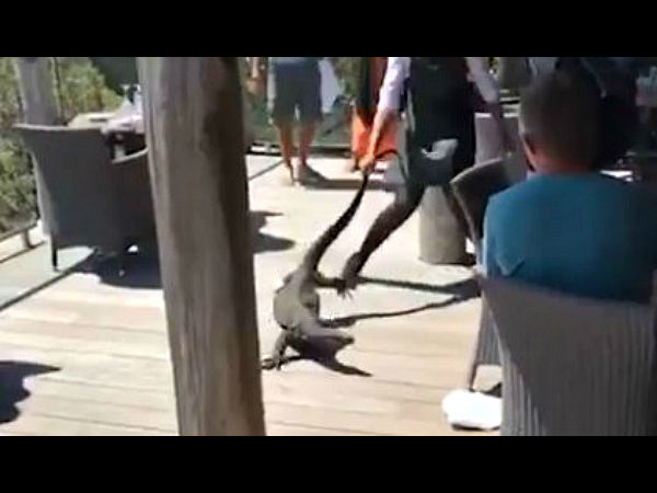 गोआना एक ऑस्ट्रेलियन छिपकली है, जो काफी बड़ी और खतरनाक होती है। लेकिन महिला ने बिना डरे हुए उसे पकड़कर रेस्टोरेंट बहर कर दिया। वहां मौजूद लोग महिला की इस बाहदुरी को देखकर तालियां बजाने लगे और महिला को शाबाशी दी। इस पूरी घटना को देखने के बाद एक फ्रेंच महिला से पूछा गया कि उसे यह करते हुए डर नहीं लगा तो उसने कहा कि पहले तो मुझे लगा कि कोर्इ डॅागी अंदर आ गया है , लेकिन जब पूंछ पकड़ी तो पता चला यह खतरनाक गोआना है। उसने कहा कि मुझे इसे करने में कोई डर नहीं लगा। देखिए कैसे महिला ने विशालकाय छिपकली को सिखाया सबक...