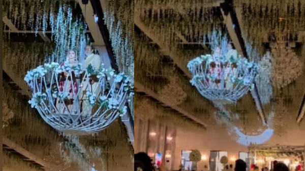 छत पर लगे झूमर पर पिता के साथ दुल्हन ने की एंट्री