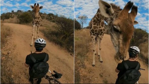 जोहान्सबर्ग, 1 मई। एक वीडियो सोशल मीडिया पर तेजी से वायरल हो रही है, जिसमें एक जिज्ञासु जिराफ सामने से आकर पर्वतारोही को रोक लेता है। जिराफ के पास आते ही पर्वतारोही की सांसे थम जाती हैं। यह वीडियो दक्षिण अफ्रीका के जोहानसबर्ग के निकट स्थित एक वन्यजीव संरक्षण पार्क का है, जहां एक जिराफ उस वक्त सामने आ गया जब टिमी मोजर अपनी प्रेमिका के साथ पहाड़ों की सैर पर साइकिल से जा रहे थे।