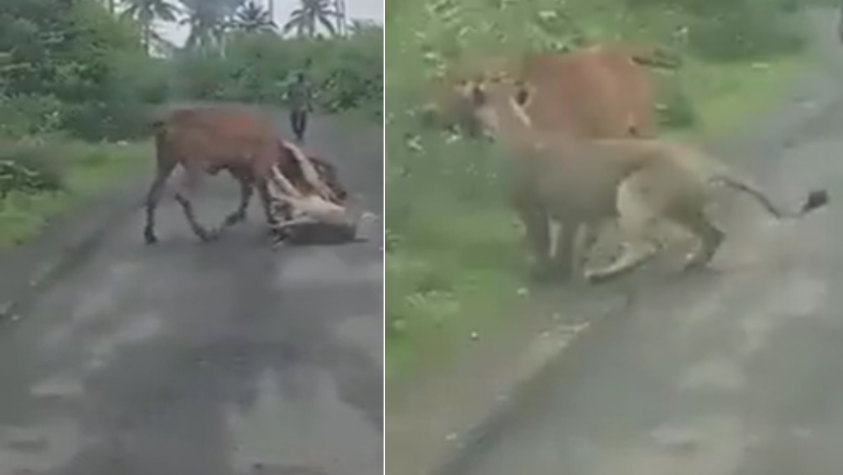 भूखे शेर ने कसकर जकड़ रखा था गाय का गला, अपनी जान की परवाह किए बगैर किसान ने ऐसे बचाया