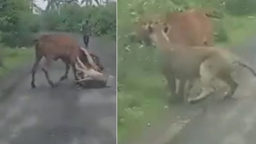 जैसे ही वीडियो शुरू होता है, शेर को गाय को जकड़ते हुए देखा जा सकता है। शेर ने गाय का गला पकड़ा हुआ होता है। गाय खुद को बचाने की मशक्कत करती हुई नजर आ रही होती है। संघर्ष करते हुए दोनों जानवर सड़क के एक किनारे चले जाते हैं। इसके बाद किसान वहां आता है और गाय को बचाने की कोशिश करता है। किसान अपना हाथ उठाता है ताकि शेर भाग सके।