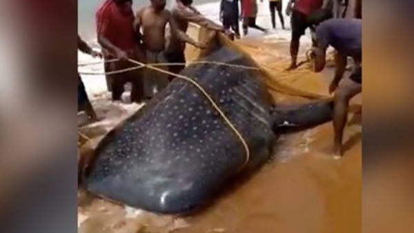 व्हेल शार्क पर सफेद धब्बे नजर आ रहे हैं। अंतरराष्ट्रीय संघ की लुप्त होने वाली प्रजातियों की सूची में इस व्हेल का नाम भी शामिल है। कई मछुआरों ने रस्सियों की मदद से व्हेल को फिर से समुद्र में छोड़ दिया। फोटो सोशल मीडिया पर वायरल होने के बाद मछुआरों की जमकर तारीफ की जा रही है। वन विभाग ने मछुआरे को उनके इस काम और दयालुता दिखाने के लिए नकद पुरस्कार देने का ऐलान किया है।