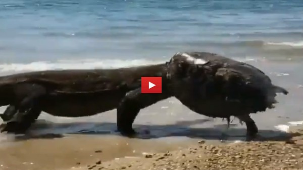 समुद्र के किनारे शूट का गए वीडियो में दिख रही तस्वीर काफी डरावनी है। इसे देखकर ये लगता है कि ये कोई नया समु्द्री जीव है। लेकिन ऐसा नहीं है ये एक कोमोडो ड्रैगन है, जिसने कछुए को खा लिया है। इसके बाद उसने कछुए की खोल अपने चेहरे पर पहन ली है। जिससे उसका चेहरा नहीं दिख रहा है।