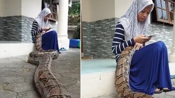 बड़े से अजगर का सिर गोद में रखकर सहला रही लड़की, वायरल हुआ VIDEO