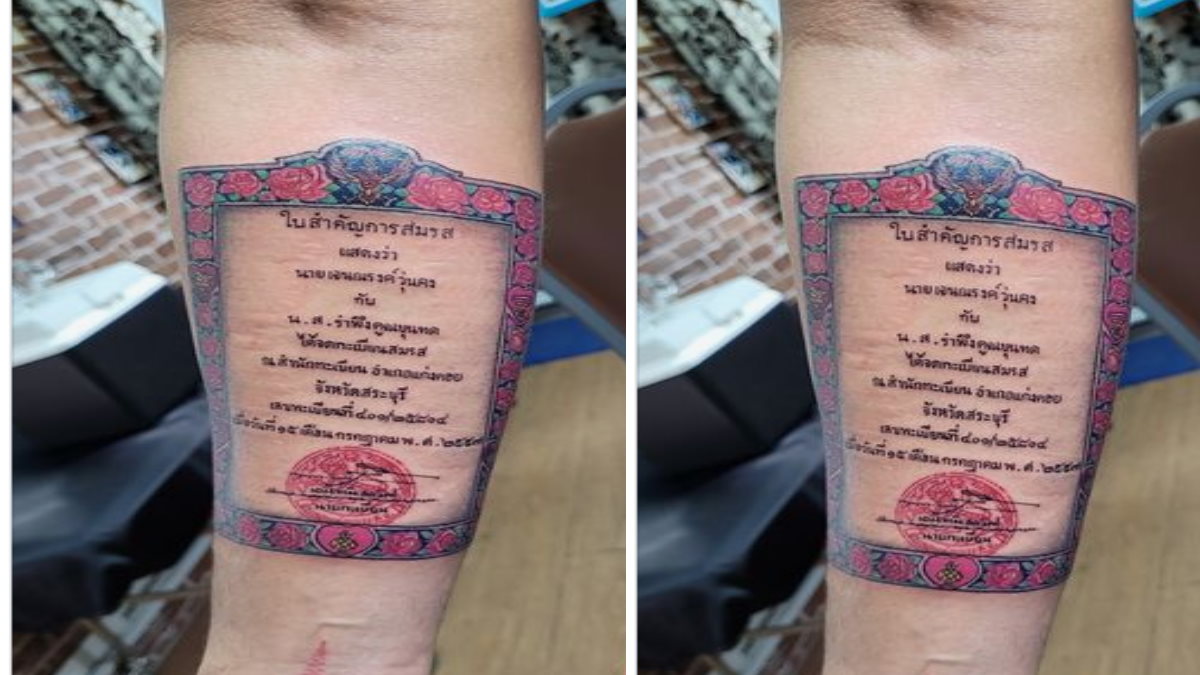 वैलेंटाइन पर पत्नी को खुश करने के लिए हाथ पर अनोखा टैटू बनवाने शख्स थाईलैंड का रहने वाला है। इस थाई व्यक्ति ने वैलेंटाइन डे में अपनी पत्नी को सरप्राइज करने के लिए अपने हाथ पर ऐसा सर्टिफिकेट ही गुदवा डाला, जिसे देखकर उसकी पत्नी भी हैरान हो गई। वहीं इस शख्स की हाथ में गुदवाए गए सर्टिफिकेट की फोटो उसे बनाने वाले टैटू पार्लर ने सोशल मीडिया पर शेयर कर दी जो वायरल हो गई।
