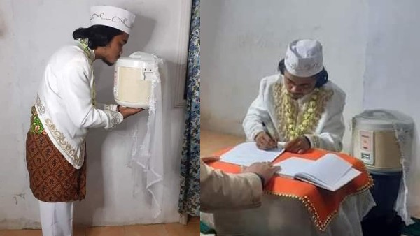 युवक इंडोनेशिया का रहने वाला है, जिसका नाम कहरोल अनम है। उसने ट्विटर पर कुछ तस्वीरें शेयर की हैं, जिसमें वो सफेद शादी की पोशाक में नजर आ रहा। उसके बगल चावल पकाने वाला कुकर रखा हुआ है, जिसको दुल्हन की ड्रेस ओढ़ाई गई है। इसके अलावा अनम कुकर के साथ ऐसे पोज में फोटो खिंचवा रहा, जैसे वो कोई लड़की हो। एक फोटो में तो वो कुकर को किस कर रहा है, जैसा आमतौर पर शादियों में दूल्हा-दुल्हन करते हैं।