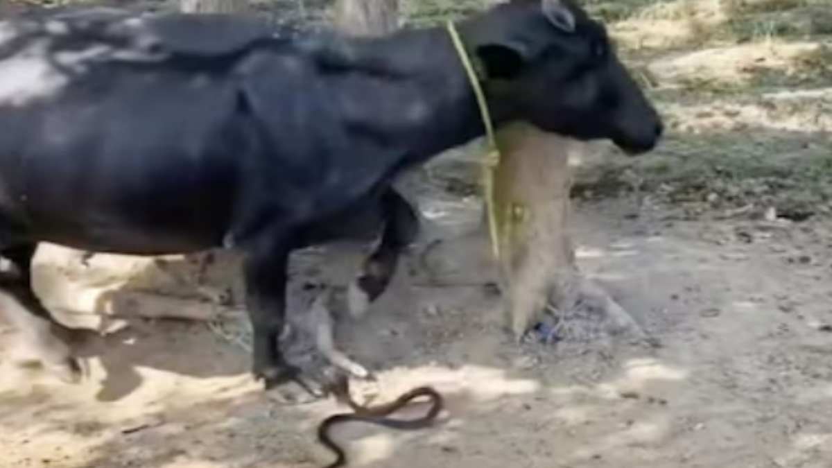इस वीडियो एक भैंस और किंग कोबरा के बीच एक भयानक आमना-सामना दिख रहा है। क्लिप ने ऑनलाइन प्लेटफॉर्मों पर यूजर्स को एक साथ ला दिया है। फुटेज में एक भैंस पेड़ से बंधा हुआ नजर आ रहा है, जो किसी शांत ग्रामीण इलाके में दिख रहा है। भैंस शांत नजर आ रही है। शुरुआती फ्रेम में तो उथल-पुथल जैसा कुछ भी नजर नहीं आ रहा है। हालांकि, अचानक भैंस काफी अशांत दिखती है क्योंकि उसे बेचैनी होने लगती है। जल्द ही इस बेचैनी का कारण भी सामने आ जाता है।