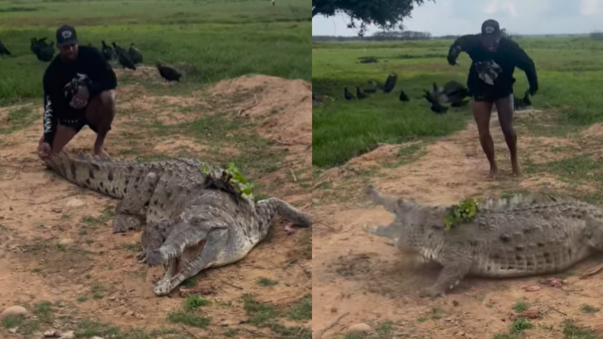 Man stunt with giant Crocodile: कई बार लोग कुछ लाइक्स और व्यूज के लिए अपनी जान को जोखिम में डालने से पहले जरा सा भी नहीं सोचते। खूंखार जानवरों से लोग ऐसे पंगा ले लेते हैं, मानो वक्त आने पर खुद को आराम से बचा लेंगे। ऐसे लोगों को जरा सी भी भनक नहीं होती कि अगर जानवर को गुस्सा आ गया तो वो शिकार करने में जरा सी भी देरी नहीं लगाएगा। ऐसा ही एक वीडियो चर्चा में है, जिसमें एक शख्स मगरमच्छ के साथ खेलता दिख रहा है।