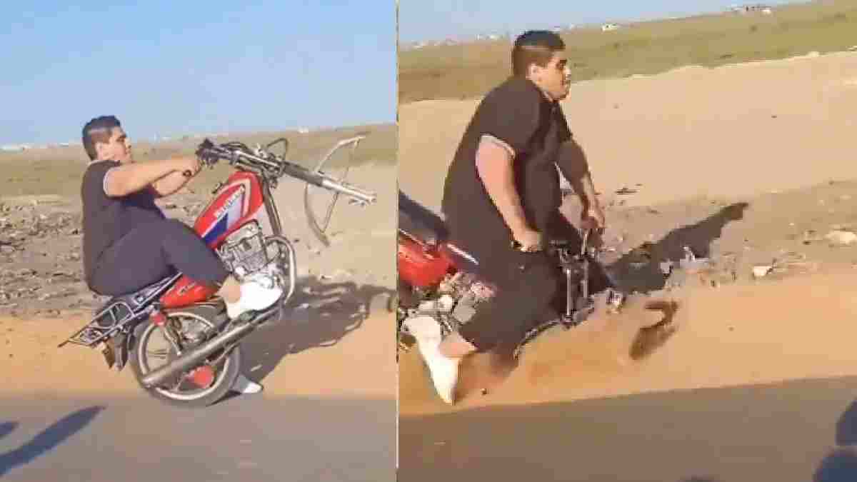 Bike Stunt Video: बाइक पर स्टंट करके दोस्तों को इंप्रेस करते आपने भी कभी न कभी किसी को देखा ही होगा। लेकिन, कभी अपने स्टंट के चक्कर में मुंह के बल किसी को गिरते नहीं देखा होगा। सोशल मीडिया पर एक वीडियो तेजी से वायरल हो रहा है। जिसमें एक युवक बिना फ्रंट पहिये की बाइक पर सवार होकर स्टंट करते नजर आया। लेकिन, 5 मिनट बाद युवक मुंह के बल गिर गया।