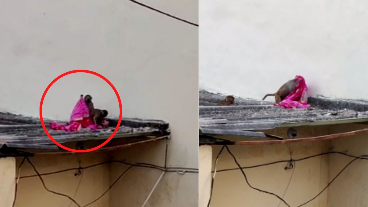 वीडियो में बंदरों को साड़ी पहनते देखा जा सकता है। एक-एक कर दोनों बंदर साड़ी को कोने-कोने से पकड़कर पहनने की कोशिश कर रहे हैं।