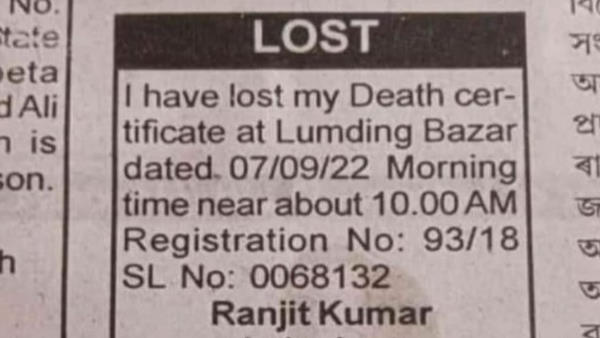 अखबार में छपे इश्तेहार में लिखा है कि दिनांक 07/09/22 को सुबह 10 बजे के करीब लुमडिंग बाजार (असम में) में मेरा डेथ सर्टिफिकेट को गया है। मेरे डेथ सर्टिफिकेट का रजिस्ट्रेशन नंबर 93/18 और सीरियल नंबर 0068132 है। व्यक्ति ने अपने पिता का नाम और अन्य जानकारी भी इस विज्ञापन में दी है। विज्ञापन देने वाले शख्स का नाम रंजीत कुमार है और वो असम का ही रहने वाला है।
