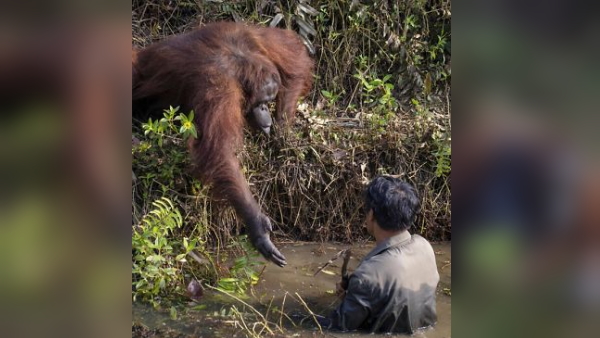 नई दिल्ली। सोशल मीडिया पर इन दिनों एक अद्भुत फोटो वायरल हो रही है जिसमें एक वनमानुष नदी में फंसे शख्स को निकालने के लिए हाथ आगे बढ़ाता दिखाई दे रहा है। वायरल हो रही फोटो इंडोनेशिया के बोर्नियो के एक वन क्षेत्र की है जहां एक शख्स सांप की तलाश में नदी में उतरता है लेकिन तभी एक आरंगुटान (बंदर की एक प्रजाति) व्यक्ति के पास आता है और उसके तरफ हाथ बढ़ाकर मदद करने की कोशिश करता है।
