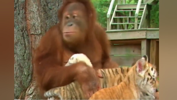 ऐसे ही एक वनमानुष की वीडियो वायरल हो रहा है जिसने सबको हैरान कर दिया है। इस वीडियो में वनमानुष (Orangutan) के साथ बाघ के कुछ बच्चे (Tiger Cubs) खेलते हुए नजर आ रहे हैं।