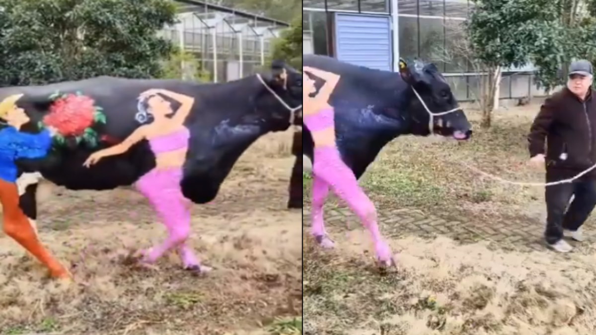 वीडियो में एक भारी भरकम गाय नजर आ रही थी, जिसके शरीर पर कपल की तस्वीर बनाई गई थी। ये एक पेंटिंग थी, जिसमें लड़का पीछे पीछे फूल लेकर आ रहा है और लड़की आगे चल रही है।