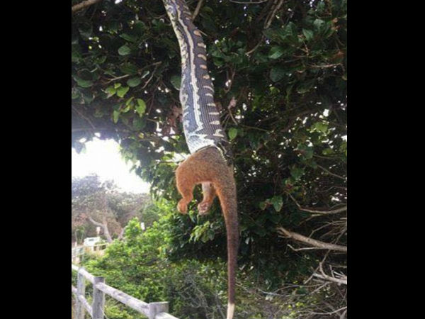 महिला ने इन वाकये तो फौरन अपने कैमरे में कैद कर लिया। अजगर पेड़ से उल्टा लटका था और possum को निगल रहा था। पेड़ से उल्टा लटके हुए भी वो अपना शिकार नहीं छोड़ रहा था। इसका पता जब और लोगों को चला तो possum निगलता अजगर देखने के लिए भीड़ इक्ट्ठा हो गई।
