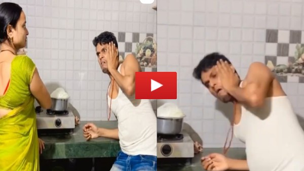 वीडियों में किचन में शख्स की घबड़ाहट साफ देखी जा सकती है। जब उसे कुछ नहीं सूझता तो वो अपनी पत्नी को पकड़कर किचन में लाता है। लेकिन पत्नी इतनी से बात पर किचन में बुलाने पर गुस्सा हो जाती है। पहले वो गैस को बंद करती है। उसके के बाद पति के गाल पर एक जोरदार तमाचा मारती है। पत्नी से मार पड़ने के बाद भी शख्स ये नहीं समझ पाता कि आखिर ऐसा क्यों हुआ? वो डरा हुआ उसी आश्चर्य में अपनी पत्नी की ओर देखता है। हलांकि इस उसे डर भी है कि अगर आगे कुछ बोला तो फिर से मार पड़ सकती है।
