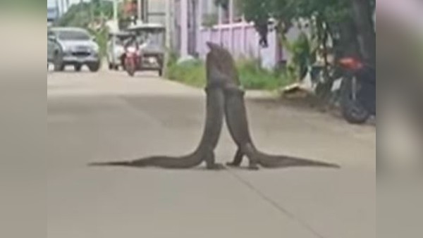 पहली बार देखने में यह वीडियो दो मॉनिटर लिजर्ड के गले लगने और प्यार करने का लगेगा, लेकिन हकीकत कुछ और है। मीडिया रिपोर्ट्स के मुताबिक दोनों के बीच सड़क पर दंगल खेला गया था। वीडिया थाईलैंड का है, जहां से ऐसे सरीसृप की घटना आम है। यहां काफी संख्या में गोह पाए जाते हैं, जिनके वीडियो आए दिन सोशल मीडिया पर तैरते हैं।