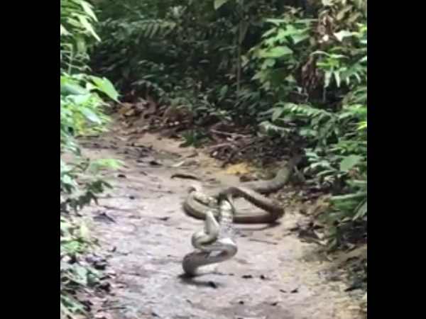 इस वीडियो को शेल्डन ट्रोलोप नामक शख्स ने अपने फेसबुक पेज पर अपलोड किया है। शेल्डन ने लिखा है कि इस वीडियो को उसके पड़ोसी ने बनाया है। वीडियो में एक विशाल अजगर और एक किंग कोबरा आपस में लड़ रहे हैं। सांपो की यह लड़ाई सिंगापुर के मैकरिची नेचर ट्रेल में बीते 30 मई को हुई, जिसका वीडियो सोशल मीडिया पर वायरल हो रहा है।