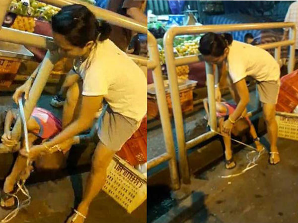 डेली मेल की रिपोर्ट के मुताबिक बैंकॉक के नॉनथाबुरी के पास एक सुपर मार्केट में महिला ने अपने बच्चे को सजा देने के लिए उसे सड़क पर रखी रेलिंग में प्लास्टिक की रस्सी से बांध दिया। महिला अपने बच्चे के सिर को झुकाकर उसे सिर पर पैर रखे हुए उसे रेलिंग से बांध रही थी। बच्चे को सिर को वो अपने पैरों से कुचलने लगी। बच्चा दर्द से रोता रहा, चिल्लता रहा, लेकिन औरत पर तो मानो भूत सवार था। वो बच्चे किसी किसी भी बात को सुनने को तैयार नहीं थी।