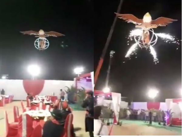 क्रेन को मूव करवाकर विमान को पंडाल से ऊपर से होते हुए मंडप के सामने उतारा गया। चील पक्षी की आकृति वाले इस खास तरह के पिंजरेनुमा स्टेज पर दूल्हा-दूल्हन आसमान में उड़ रहे थे तो नीचे जमान पर लोग उन्हें देखकर तालियां बजा रहे थे। बैकग्राउंड में 'बहारों फूल बरसाओ' गाना चल रहा है। पंडाल के चक्कर काट कर उनका खास विमान मंडप में उतर गया, जिसके बाद लोगों ने उनका भव्य स्वागत किया। देखिए वीडियो...