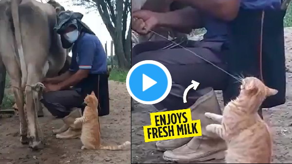 यहां बिल्ली के दूध पीने की बात हम यूं ही नहीं कर रहे हैं, आईए और देखिए यह वीडियो। एक युवक गाय से दूध दुह रहा है और बिल्ली वहां आ बैठती है। आप देख सकते हैं कि कैसे बिल्ली दूध पीने के लिए युवक के पैर में अपने पैर मार-मारकर इशारा कर रही है। युवक गाय के थन (बूब्स) बिल्ली की ओर करके दबाता है तो दूध की धार बिल्ली के मुंह पर पड़ती है।