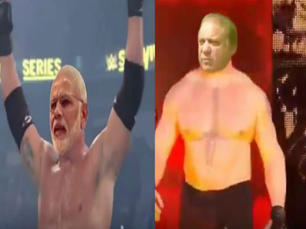 प्रधानमंत्री नरेंद्र मोदी और पाकिस्तान के पूर्व प्रधानमंत्री नवाज शरीफ का गले मिलने वाला फोटो और वीडियो तो आपने पहले भी देखा होगा, लेकिन आज जो वीडियो हम आपको दिखाने जा रहे हैं वो गले मिलने का नहीं बल्कि मुक्के मारने का है। वीडियो में दोनों नेताओं के बीच फाइट को दिखाया गया है। डब्लूडब्लूई के रिंग में भारत के प्रधानमंत्री नरेंद्र मोदी पाकिस्तानी नेता को चंद सेंकडों में हरा देते हैं।