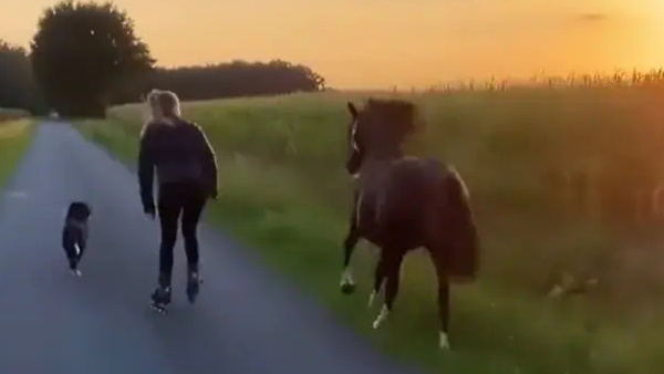 क्लिप में महिला स्केलिंट करती हुई सूनसान सड़क पर भाग रही है तो उसका घोड़ा उसके पीछे लेकिन कुत्ता काफी आगे भाग रहा है। तीनों की दोस्ती देखते ही बन रही है। कुत्ता तो बेफिक्र होकर कभी महिला से काफी आगे भागता है तो कभी सड़क किनारे खेत में दौड़ता नजर आ रहा है लेकिन घोड़ा अपनी मालकिन के कभी पीछे तो कभी साथ ही दौड़ता दिख रहा है। मानों उसे उनकी बड़ी चिंता हो।