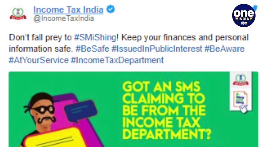 इनकम टैक्स डिपार्टमेंट ने लोगों को SMS के जरिए हो रही धोखाधड़ी को लेकर अलर्ट किया है। टैक्स डिपार्टमेंट ने ट्वीट कर इसकी जानकारी दी है और लोगों को SMiShing के शिकार न बनने की सलाह दी है। IT डिपार्टमेंट ने लोगों को अपनी वित्तीय और निजी जानकारी को सुरक्षित रखने की सलाह दी है। वहीं इनकम टैक्स डिपार्टेमेंट के एसएमएस के शार्ट कोड भी जारी किए हैं।