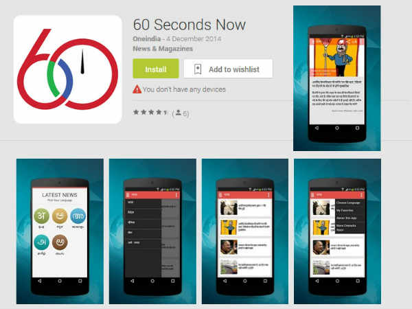 बेंगलुरु। भारत की क्षेत्रीय भाषाओं में पढ़ा जाने वाला नंबर वन पोर्टल वनइंडिया आपके लिये लाया है 60 सेकेंड्स नॉउ एंड्रॉयड ऐप। इस ऐप को डाउनलोड करने के बाद आप अपन एंड्रॉयड फोन पर मात्र 60 सेकेंड में दुनिया भर की ताज़ा खबरें पढ़ सकेंगे। इसकी खासियत यह है कि यह बीबीसी से लेकर आज तक, एनडीटीवी तक हर बड़े-छोटे चैनलों से यह ऐसी खबरें आपके लिये चुन कर लाता है, जिसका आपसे सीधा सरोकार है।