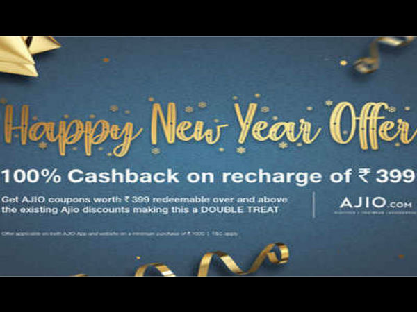 रिलायंस जियो ने अपने यूजर्स के लिए हैप्पी न्यू ईयर ऑफर पेश किया है। जिसके तहत 399 रुपए के रिचार्ज पर यूजर्स को 100 फीसदी कैशबैक मिल रहा है। इस ऑफर में जियो यूजर्स को AJIO पर 399 रुपए का अतिरिक्त डिस्काउंट मिलेगा। कंपनी ने इस ऑफर को अपने ने अपनी ई कॉमर्स वेबसाइट AJIO के साथ मिलकर लॉन्च किया है। आपका बता दें कि AJIO एक फैशन रिटेल वेबसाइट है।