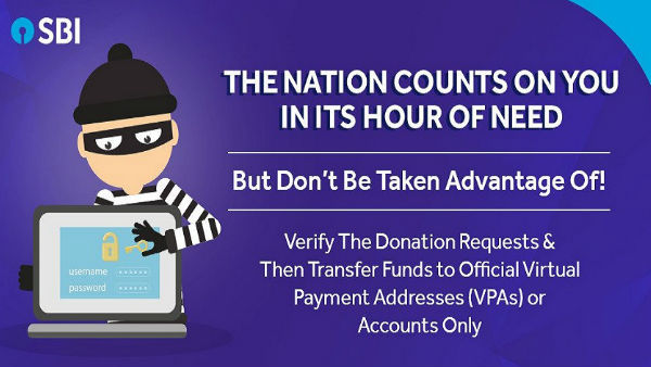 SBI ने ट्वीट कर अपने खाताधारकों को अलर्ट किया है और कहा है कि अगर आप बाढ़ पीड़ितों की मदद करना चाहते हैं, तो सबसे पहले यह सुनिश्चित करें कि आप ऑफिशियल रिलीफ फंड वर्चुअल पेमेंट एड्रेस के जरिए ही डोनेशन दें। बैंक ने कहा है कि अगर आपके पास डोनेशन के लिए कोई रिक्वेस्ट आता है तो आप पहले उसे वेरीफाई करें। बिना वेरीफाई किए ऑफिशियल वर्चुअल पेमेंट एड्रेस पर पैसे ट्रांसफर करने से हमेशा बचना चाहिए। ऐसा न करने पर आप धोखाधड़ी के शिकार हो सकते हैं।