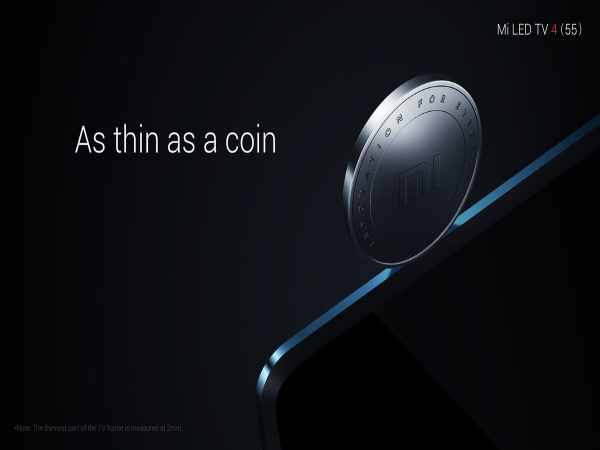 शाओमी ने अपने स्मार्ट टीवी, Mi TV 4 को लॉन्च करते हुए दावा किया कि यह दुनिया का सबसे पतला टीवी है। यह टीवी 10 रुपये के सिक्के इतना पतला है। इसकी मोटाई 4.99 मिलीमीटर है। 55 इंच में लॉन्च हुई इस टीवी के अन्य फीचर्स की बात करें तो इस टीवी में 4K एचडीआर फ्रेमलेस डिस्प्ले है। साथ ही टीवी की प्रोसेसिंग को मजबूत बनाने के लिए इसमें 2GB रैम और 8GB की इंटरनल मेमोरी दी गई है।