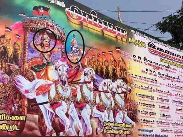 चेन्नई में लगे इस होर्डिंग में इस तरह का दृश्य बनाया गया है, जैसा महाभारत के दौरान सारथी के रूप में कृष्ण अर्जुन के साथ रहते हैं। सोशल मीडिया पर लोग इस बात को लेकर आश्चर्य जता रहे हैं कि आखिर द्रविड़ों की राजनीति करने वाले राजनीतिक दलों के पोस्टर पर धर्म के सिंबल के इस्तेमाल को किस तरह से देखा जाए, लोग सवाल कर रहे हैं कि क्या ये एक नई तरह की राजनीति की शुरुआत है। वहीं कुछ लोग होर्डिंग को डिजाइन करने वाले कलाकार की तारीफ भी खूब कर रहे हैं।