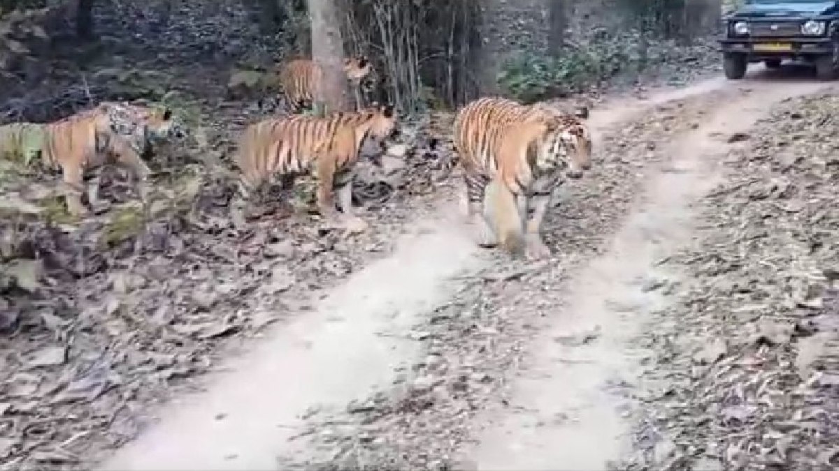 Panna Tiger Reserve: मध्य प्रदेश के पन्ना टाइगर रिजर्व में कोहरे के बीच सुबह-सुबह जंगल सफारी के दौरान कुछ पर्यटकों के सामने बाघ का पूरा परिवार आ गया। सुबह-सुबह एक साथ पांच बाघों के दीदार करके पर्यटक रोमांचित हो उठे। उनकी खुशी का ठिकाना नहीं रहा। पर्यटकों ने ठंड में टाइगर रिजर्व का पूरा आनंद लिया।