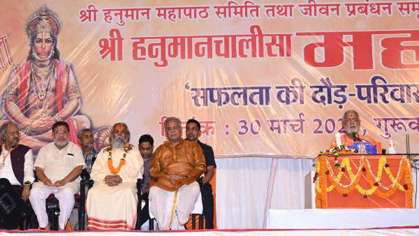 Chhattisgarh: छत्तीसगढ़ के मुख्यमंत्री भूपेश बघेल गुरुवार शाम यहां राजधानी रायपुर के बलवीर सिंह जुनेजा इंडोर स्टेडियम परिसर में श्री हनुमान महापाठ समिति तथा जीवन प्रबंधन समूह रायपुर द्वारा आयोजित हनुमान चालीसा महापाठ कार्यक्रम में शामिल हुए। इस अवसर पर मुख्यमंत्री ने उपस्थित सभी हनुमान भक्तों के साथ हनुमान चालीसा का पाठ किया। कार्यक्रम में मुख्यमंत्री बघेल ने पंडित विजयशंकर मेहता द्वारा 'सफलता की दौड़-परिवार मत तोड़' विषय पर व्याख्यान का श्रवण किया।
