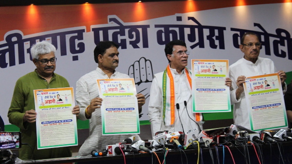CHHATTISGARH ELECTION CONGRESS POSTER: छत्तीसगढ़ विधानसभा चुनाव मिशन में जुटी कांग्रेस ने रायपुर में एक पोस्टर जारी करके भाजपा और अडानी के कथित रिश्ते पर पर निशाना साधा है। गुरुवार को कांग्रेस के राज्य कार्यालय राजीव भवन में कांग्रेस प्रवक्ता पवन खेड़ा ने पत्रकारों के सामने चुनावी पोस्टर जारी किया,जिसमे लिखा हुआ था कि कमल दबाएंगे तो अडानी निकलेगा।
