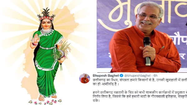 मुख्यमंत्री भूपेश बघेल ने इस संबंध में अपने ट्वीट में कहा है कि छत्तीसगढ़ का वैभव, संपन्नता हमारे किसानों से है, उनकी खुशहाली में छत्तीसगढ़ महतारी का ही आशीर्वाद है। हमने छत्तीसगढ़ महतारी के चित्र को सभी शासकीय कार्यक्रमों में प्रमुखता से स्थान देने का निर्णय लिया है, जिससे कि हमें हमारी माटी के गौरवशाली इतिहास, संस्कृति का स्मरण हो सके। गौरतलब है कि मुख्यमंत्री की पहल पर शासकीय कार्यक्रमों की शुरूआत राज्यगीत 'अरपा पैरी के धार' के साथ की जा रही है।