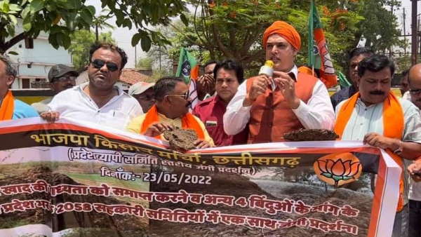 छत्तीसगढ़: जैविक खाद को लेकर सियासत, भाजपा के किसान मोर्चा ने गोबर लेकर किया प्रदर्शन