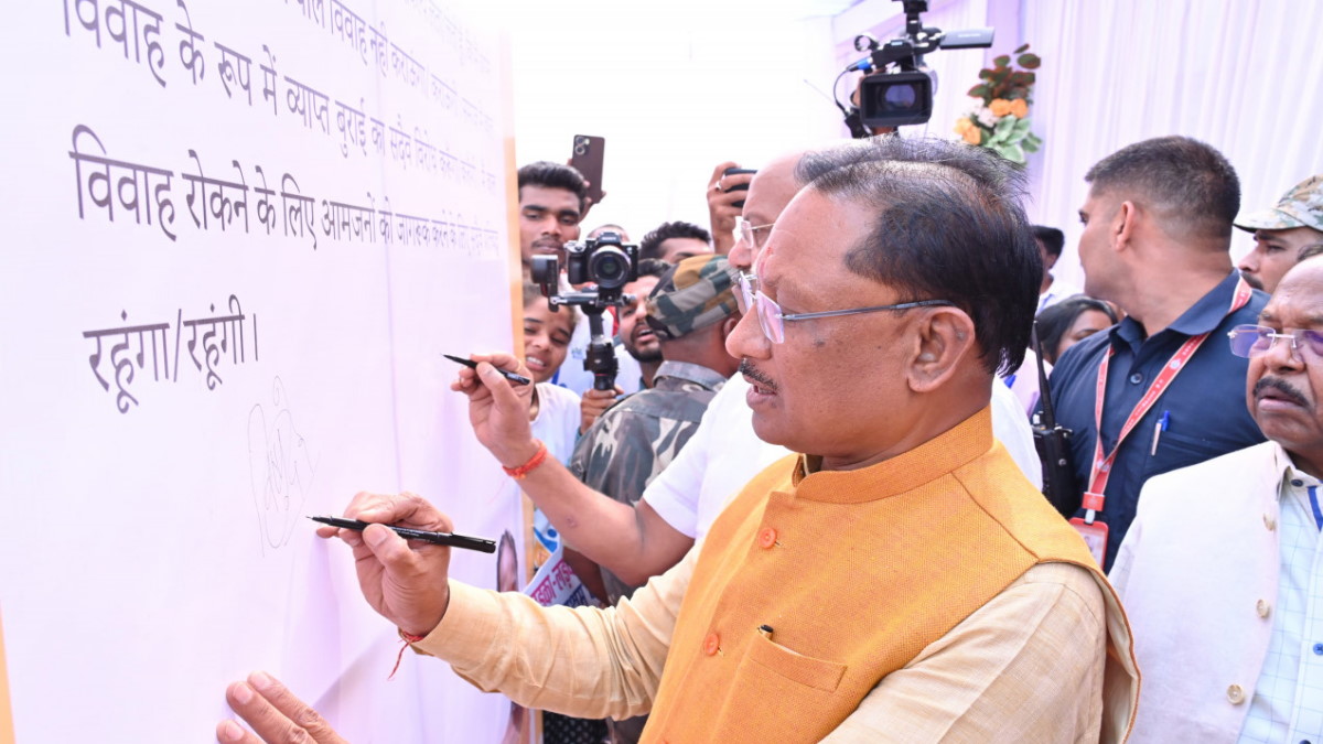 मुख्यमंत्री साय के नेतृत्व में जनप्रतिनिधियों और महिलाओं ने, बाल विवाह नहीं करवाने, समाज में बाल विवाह के रूप में व्याप्त बुराई का सदा विरोध करने और बाल विवाह रोकने के लिए आमजन को जागरूक करने का संकल्प लिया।