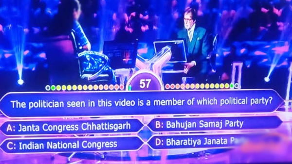 विकल्प में जनता कांग्रेस छत्तीसगढ़, बहुजन समाज पार्टी, भारतीय राष्ट्रीय कांग्रेस और भारतीय जनता पार्टी दिया गया था। हालांकि महिला प्रतिभागी इस सवाल का जवाब नहीं दे पाईं और लाइफ लाइन का इस्तेमाल करते हुए दूसरे प्रश्न का चयन किया।