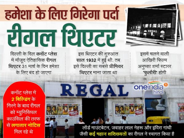 नई दिल्ली। चर्चित रीगल थिएटर बंद होने जा रहा है। दिल्ली के कनॉट प्लेस स्थित इस सिंगल स्क्रीन पर 31 मार्च को आखिरी बार पर्दा गिरेगा। यहां आखिरी फिल्म अनुष्का शर्मा की फिलौरी लगेगी। करीब 84 साल बाद यह थिएटर बंद होने जा रहा है।
