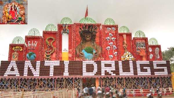 इस बार लाल मैदान में दुर्गा उत्सव समिति ने नशा मुक्ति अभियान की थीम पर पंडाल तैयार किया है। पंडाल के बाद नशे के सामग्रियों की आकृतियां बनी है। जिसमें आपको 25 हजार शराब की बोतलें नजर आएंगी। इन बोतलों से एंटी ड्रग्स लिखा गया है। पवित्रता ले लिए इन बोतलों को पूरी तरह से साफ किया गया है। इसके साथ ही अलग अलग कम्पनियों के 10 लाख गुटखा पैकेट का जाल, ड्रग्स, सीरिंज, सिगरेट, गांजा, बीड़ी की आकृतियां, देखने को मिलेंगी। सिगरेट के आग में जलता हुआ इंसान, ड्रग्स के इंजेक्शन से लाल होती धरती, गुटखा खाने के बाद कैंसर जैसी बीमारियों से बिगड़ता चेहरा, शराब से बर्बाद होता परिवार, जुआ के लत में फंसकर बर्बाद होता इंसान, नशासूर द्वारा पृथ्वी को निगलते हुए दर्शाया गया है।
