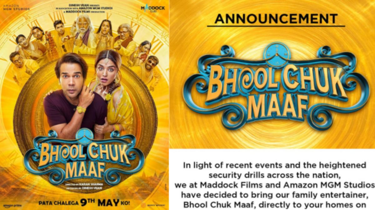 मेकर्स ने जो बयान जारी किया है। उसमें लिखा, हाल की घटनाओं और पूरे देश में कड़ी सुरक्षा व्यवस्था के मद्देनजर, मैडॉक फिल्म्स (फिल्म को बनाने वाली कंपनी) और अमेज़ॅन एमजीएम स्टूडियोज ने 16 मई को प्राइम वीडियो पर दुनिया भर में अपने पारिवारिक मनोरंजन, भूल चूक माफ़ को सीधे आपके घरों तक लाने का फैसला किया है। हालांकि हम सिनेमाघरों में आपके साथ इस फ़िल्म का जश्न मनाने के लिए उत्सुक थे। लेकिन राष्ट्र की भावना सबसे पहले आती है। जय हिंद।